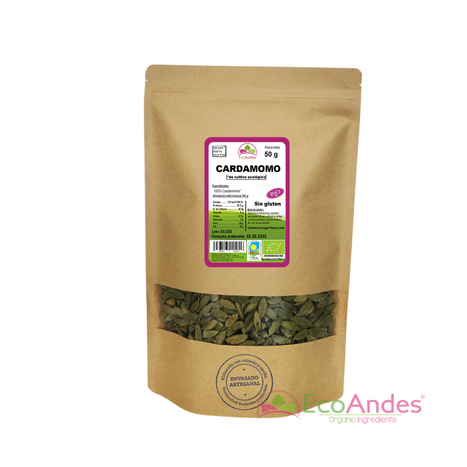 Bolsa de 50 g de cardamomo en grano orgánico de la marca EcoAndes. El envase es de papel kraft con ventana transparente que muestra el contenido, etiqueta frontal con información nutricional, certificaciones ecológicas, sin gluten y sello de "envasado artesanal".
