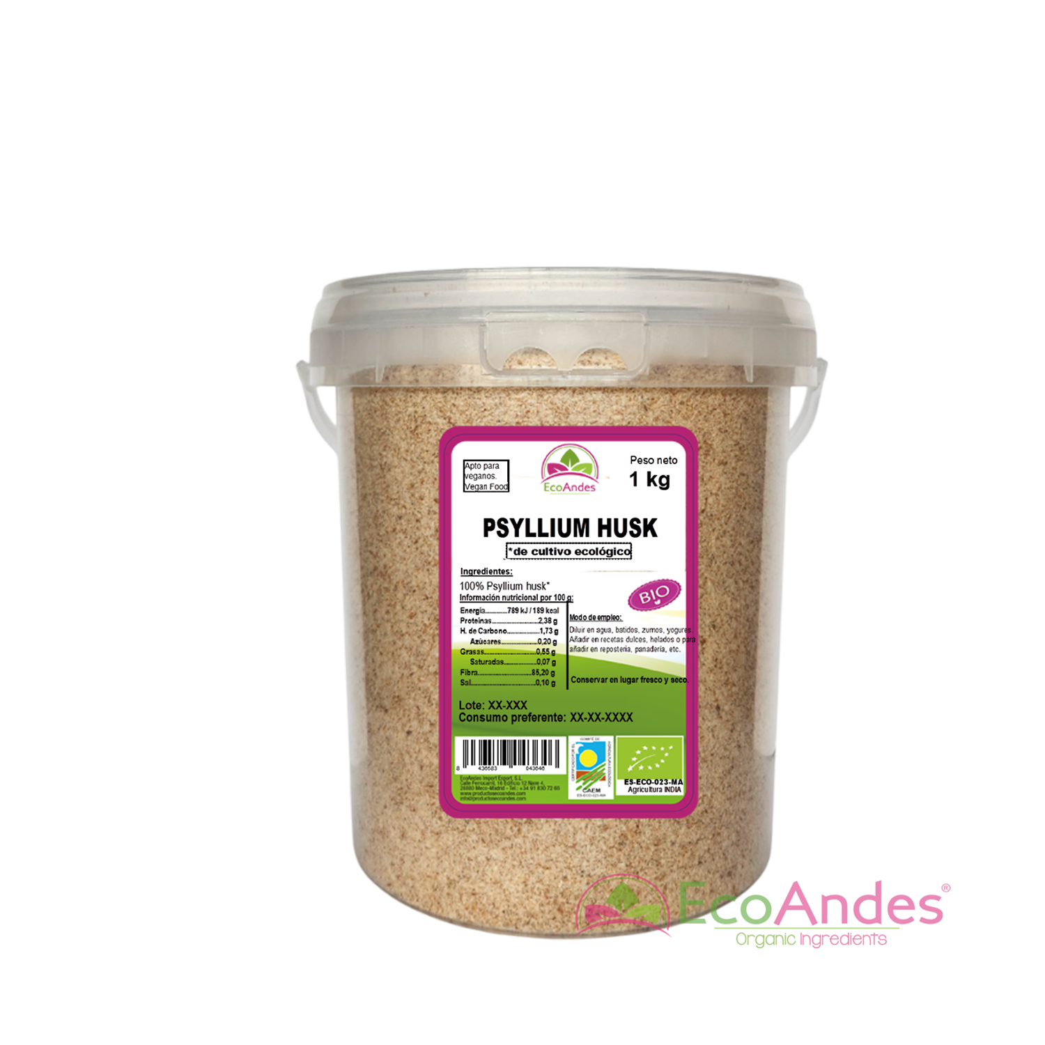 Cubo cilíndrico de 1kg de Psyllium en cascara de la marca EcoAndes. El envase es de papel kraft con ventana transparente que muestra el contenido, etiqueta frontal con información nutricional, certificaciones ecológicas, sin gluten y sello de "envasado artesanal".