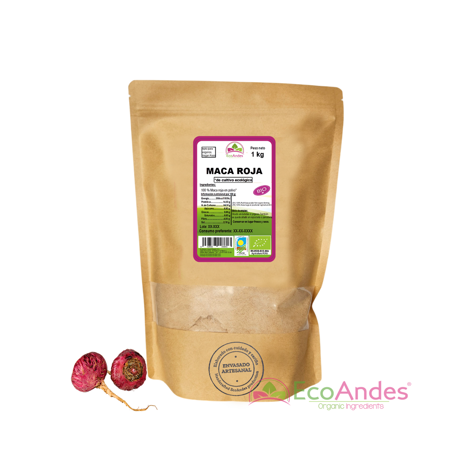 Bolsa de 1kg de Maca roja en polvo de la marca EcoAndes. El envase es de papel kraft con ventana transparente que muestra el contenido, etiqueta frontal con información nutricional, certificaciones ecológicas, sin gluten y sello de "envasado artesanal".