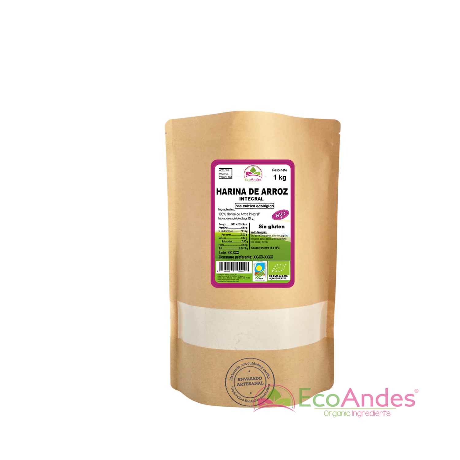 Bolsa de 1kg con contenido de Harina de arroz integral de la marca EcoAndes. El envase es de papel kraft con ventana transparente que muestra el contenido, etiqueta frontal con información nutricional, certificaciones ecológicas, sin gluten y sello de "envasado artesanal".