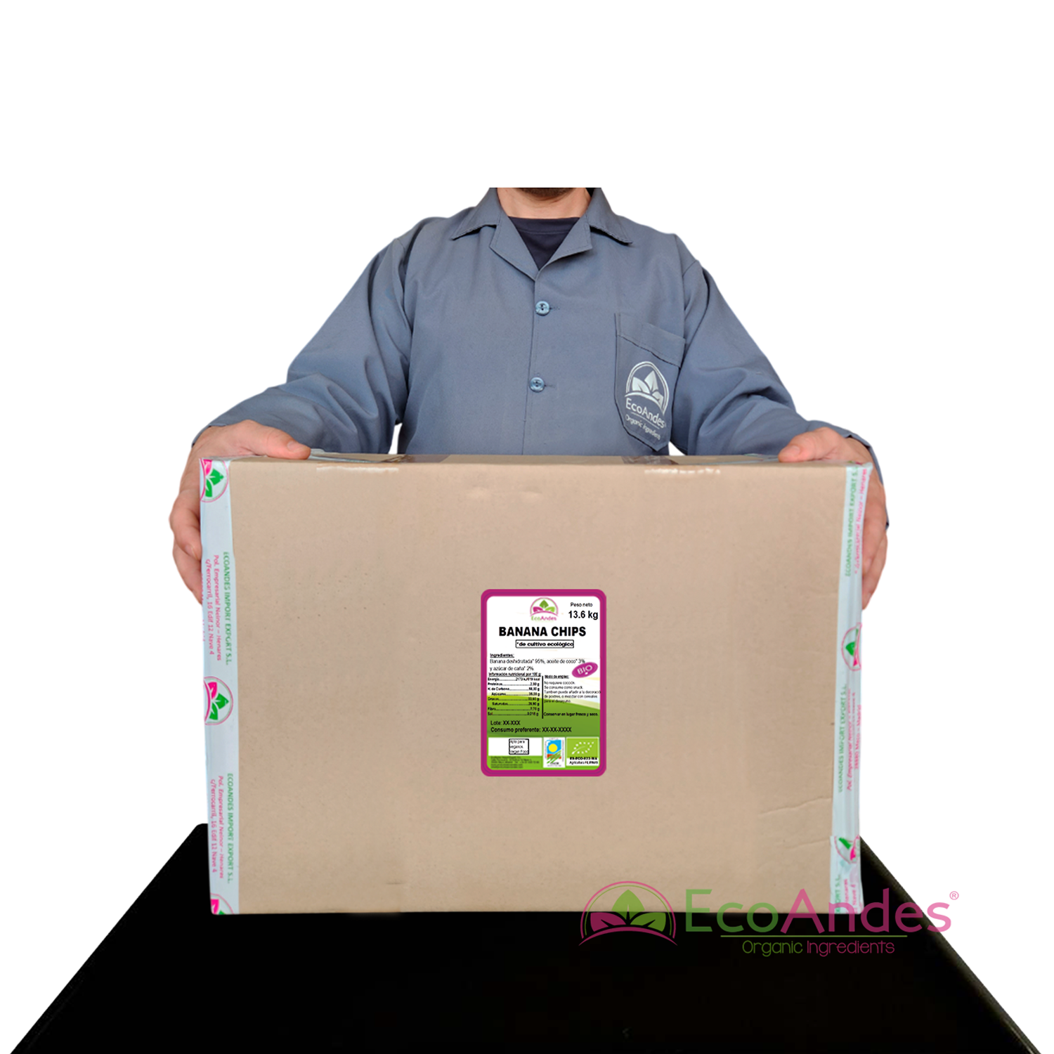 Persona con bata de laboratorio de la marca EcoAndes sosteniendo una caja de 13,6 kg de Banana chips. El empaque muestra una etiqueta con información del producto, certificaciones ecológicas y sello de calidad y envasado artesanal.