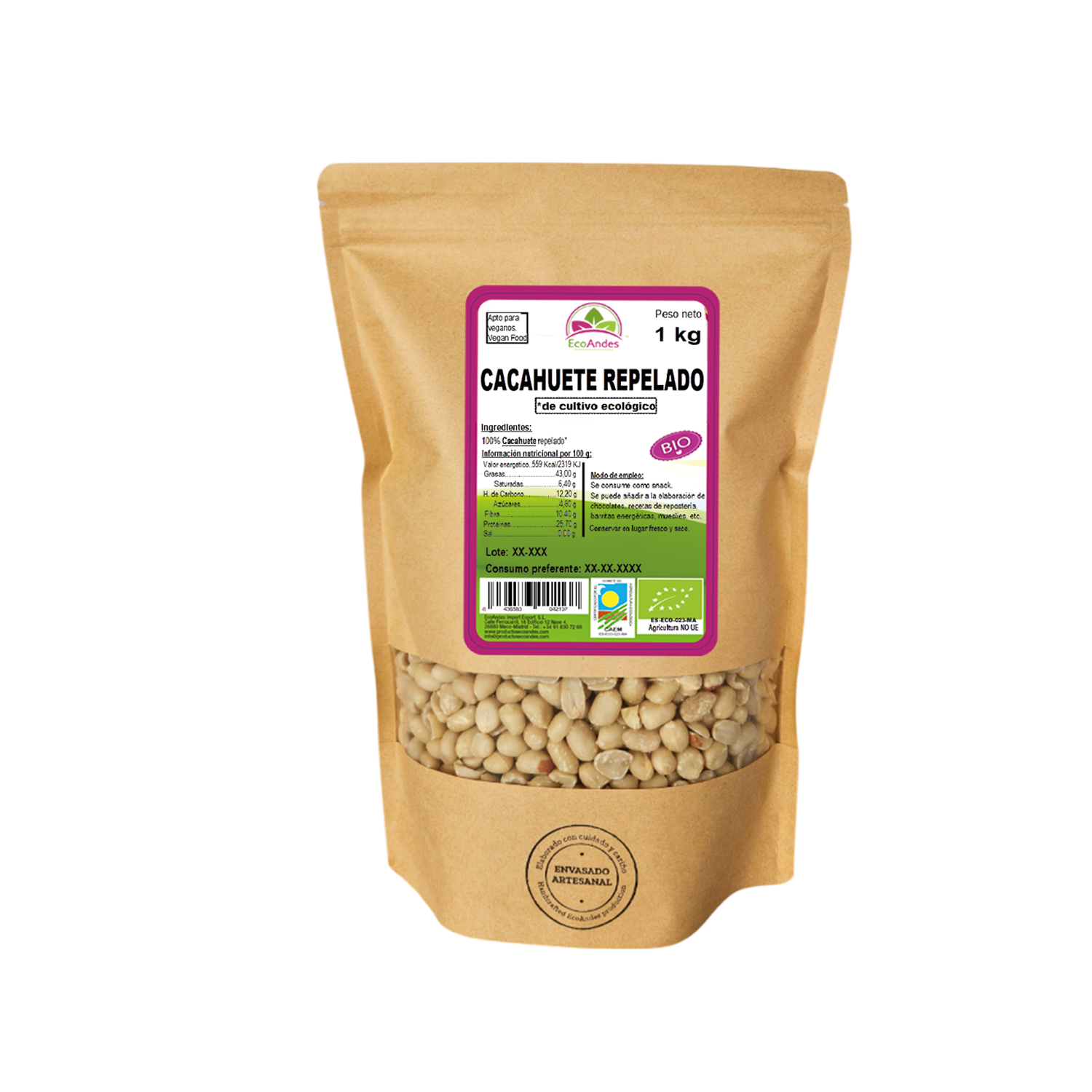 Bolsa de 1kg de Cacahuete repelado de la marca EcoAndes. El envase es de papel kraft con ventana transparente que muestra el contenido, etiqueta frontal con información nutricional, certificaciones ecológicas, sin gluten y sello de "envasado artesanal".