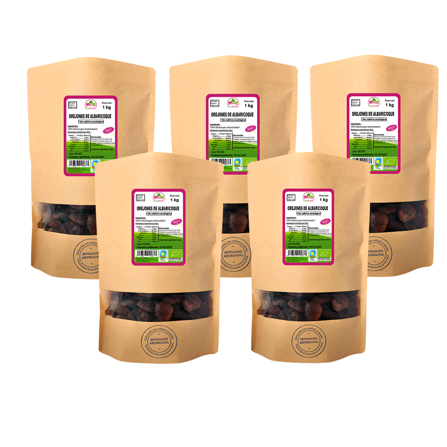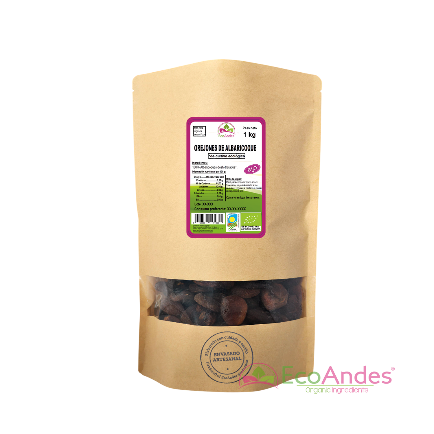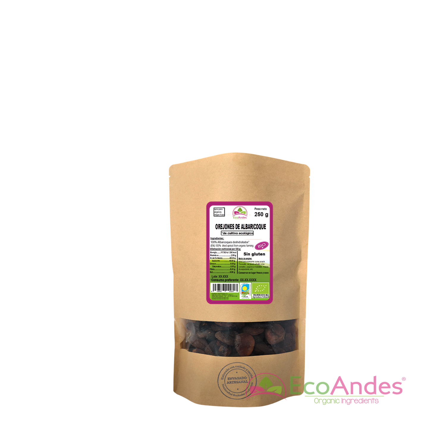 Orejones de albaricoque (100%) –  Procedente de cultivo ecológico.