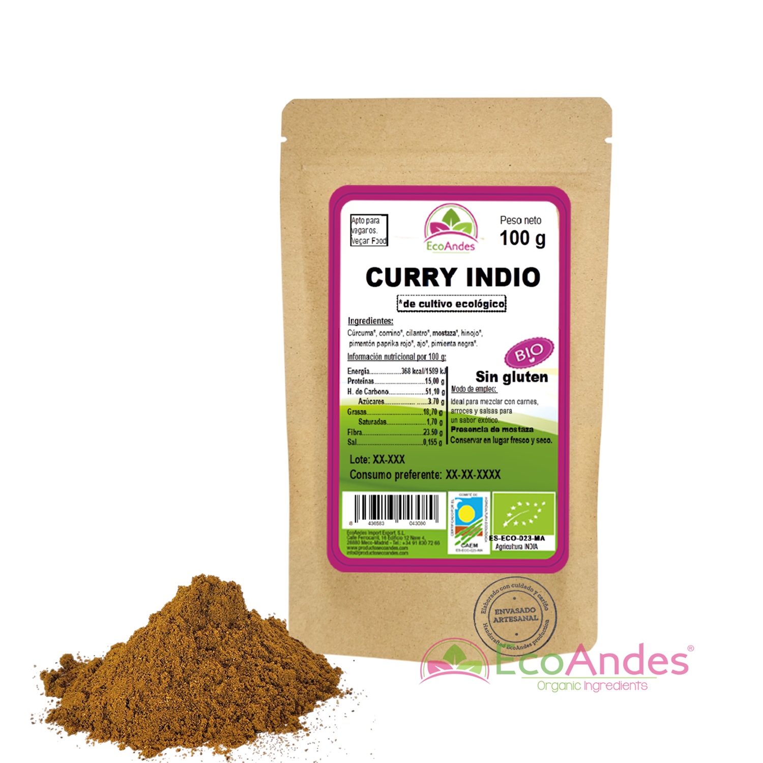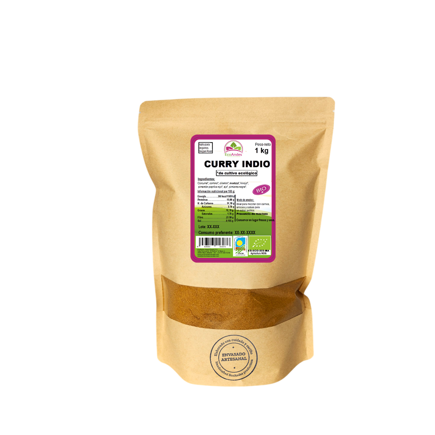 Curry en polvo contiene: Cúrcuma, comino, cilantro, mostaza, hinojo, pimentón paprika rojo, ajo, pimienta negra. Sin aditivos, sin conservantes ni colorantes.